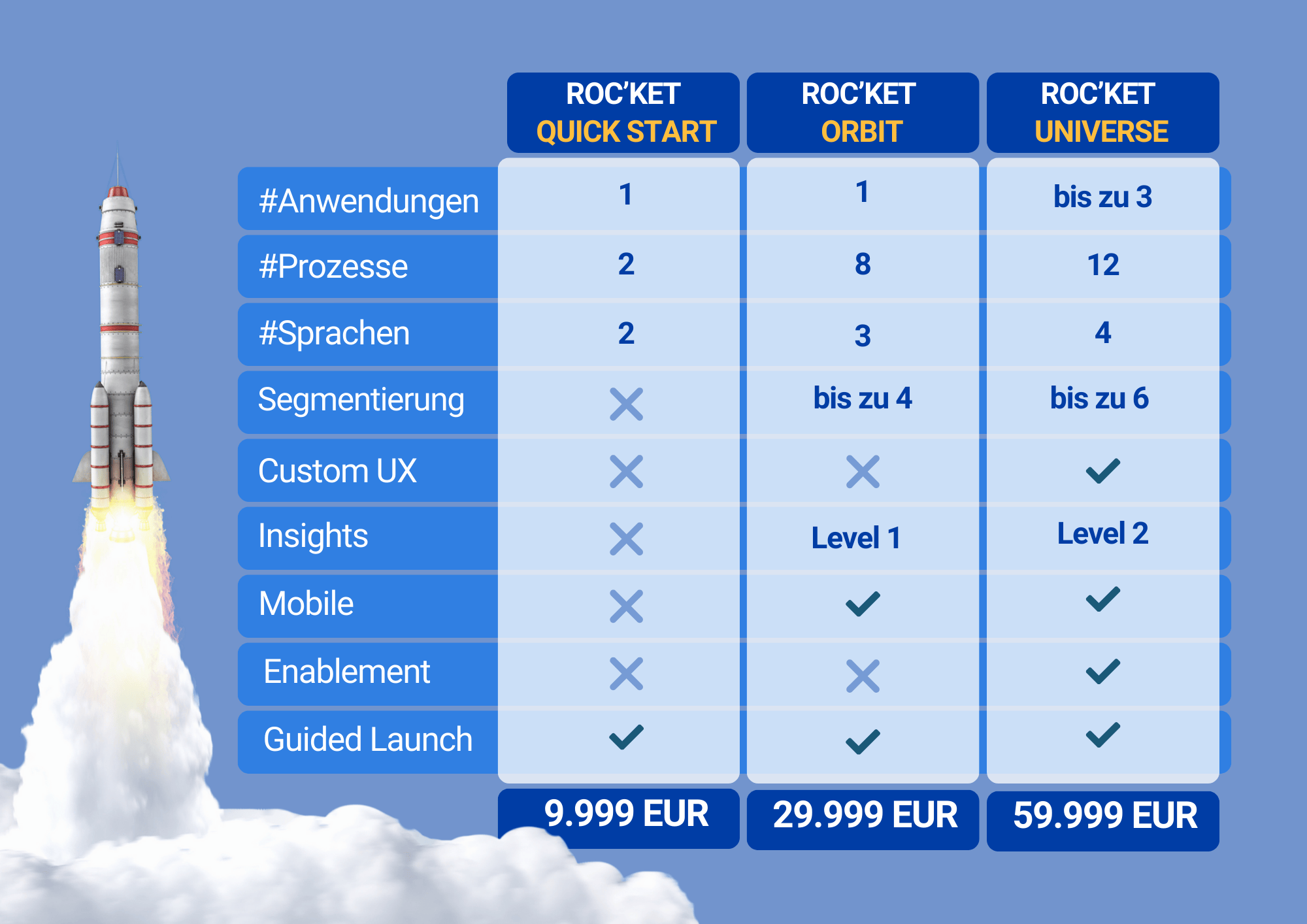 Ob kompakter Start, erweiterter Funktionsumfang oder vollumfängliches WalkMe-Setup: Mit unseren roc’ket Paketen finden Sie genau das Modell, das zu Ihren Anforderungen passt.